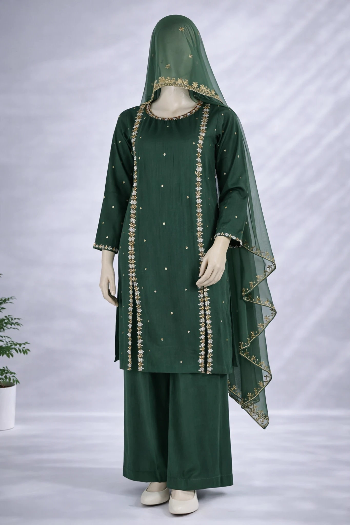 The kurta features delicate embroidery enhanced with fine embellishments that add a touch of sophistication without overpowering the design. Paired with a stylish plazo trouser, the outfit offers a modern silhouette with relaxed comfort. The coordinated dupatta completes the look, adding graceful movement and a polished finish.