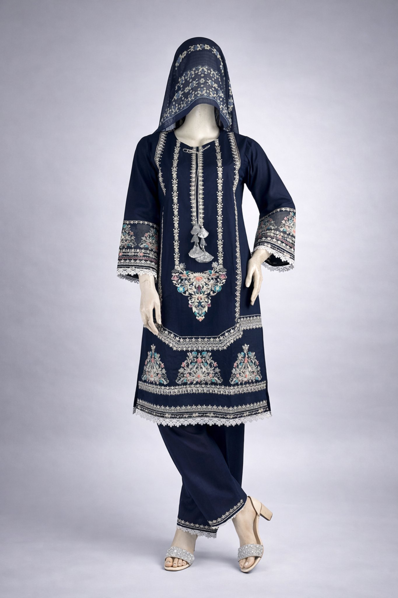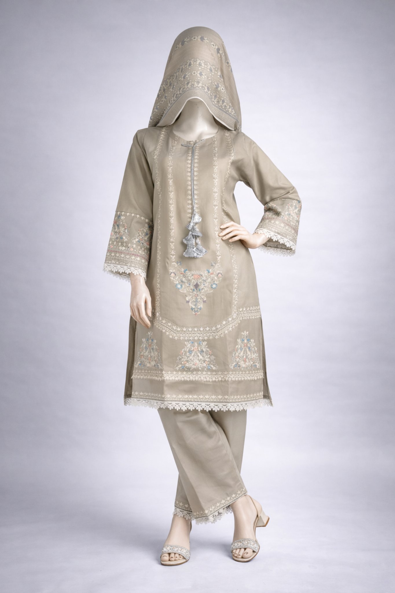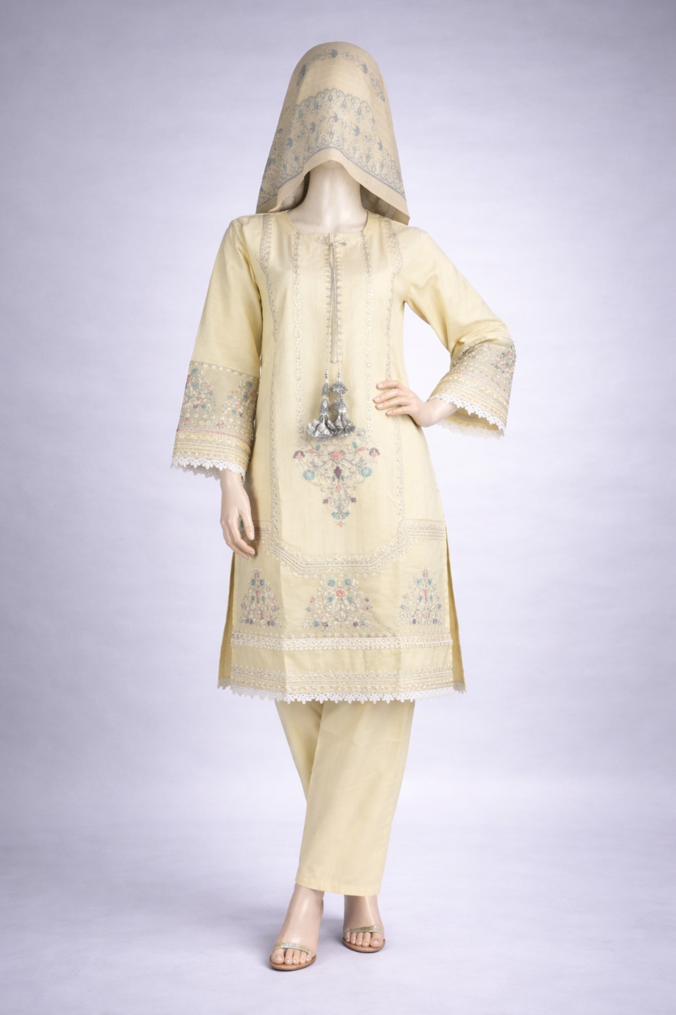 The kurta features intricate embroidery on the front panel, sleeves, and borders, enhanced with delicate lace detailing that reflects fine craftsmanship. The straight-cut lawn cotton trousers are kept simple and minimal, providing a clean silhouette that perfectly balances the detailed kurta. A matching lightweight dupatta completes the look with subtle printed accents for an elegant finish.