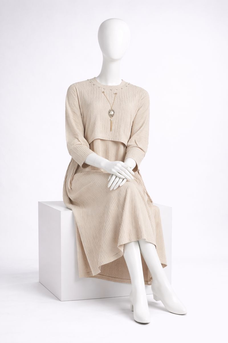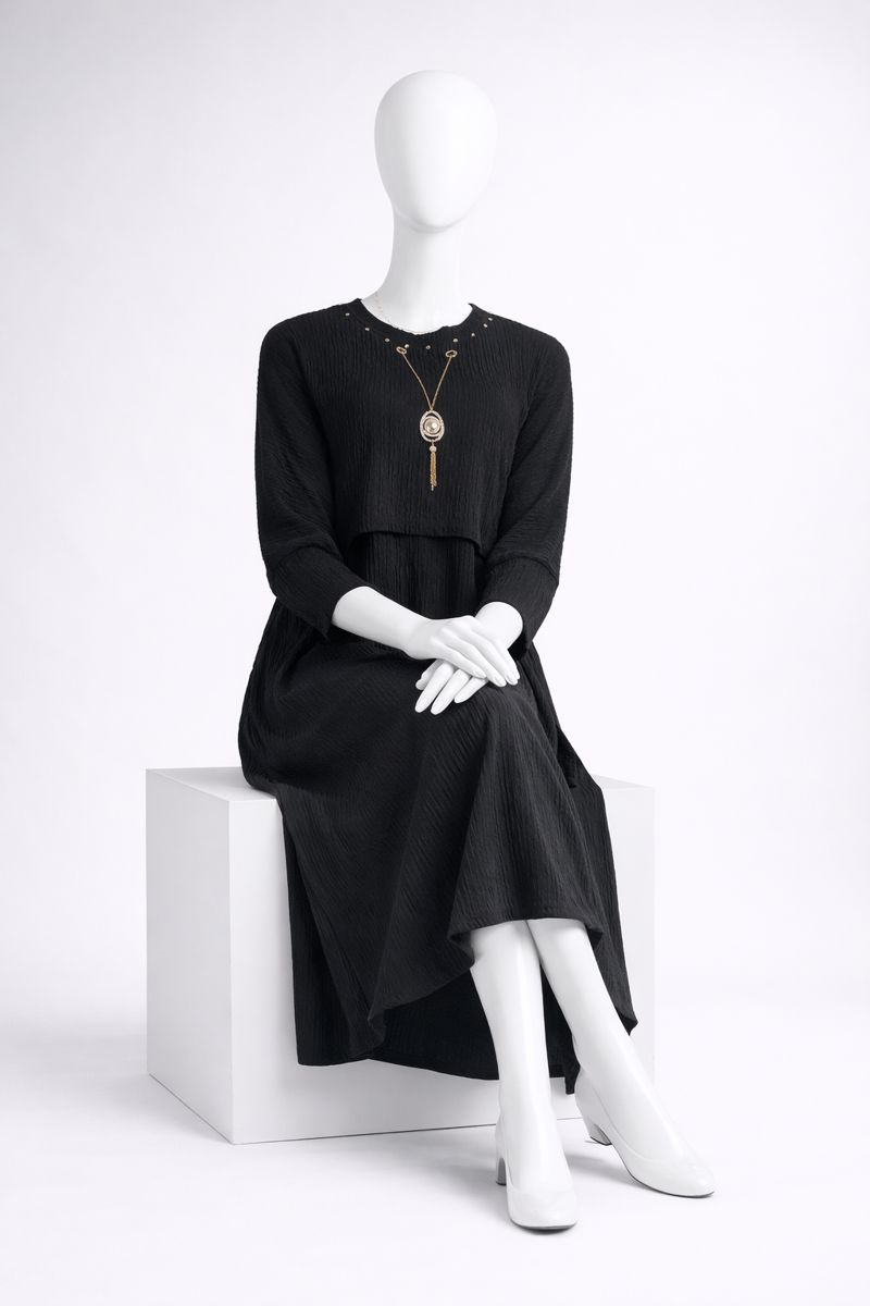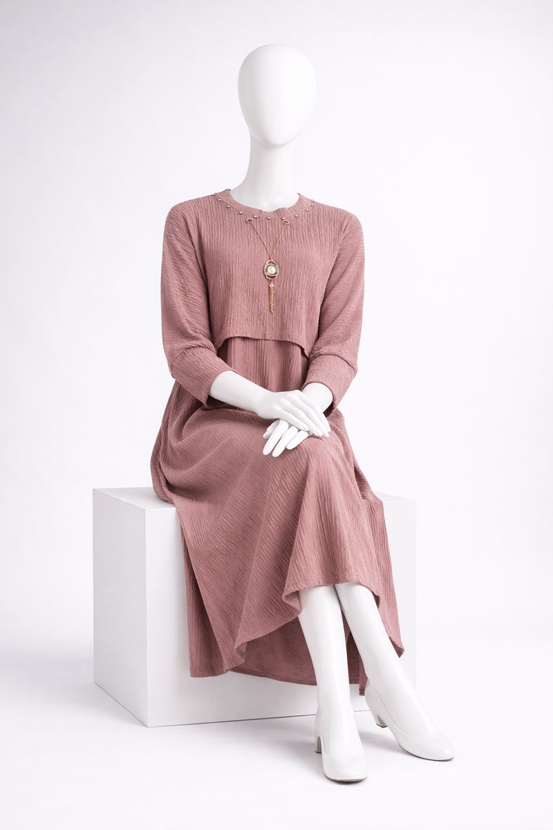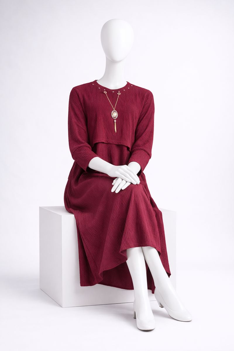 The modest round neckline is enhanced with subtle embellishments and a removable statement pendant, adding a refined touch. Long sleeves and a flowing maxi length make this dress ideal for everyday wear, gatherings, or special occasions.